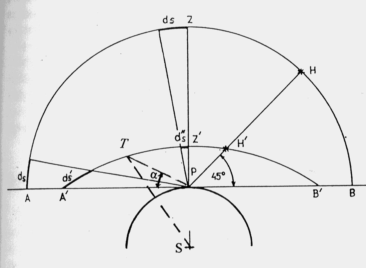 Sluneční disk, který má konstantní úhlový průměr dS (obr.1.3.1),se v různých výškách nad obzorem jeví různě veliký při projekci (dS',dS") na zdánlivý tvar oblohy (tzv. zdánlivá nebeská klenba). Proto se nám Slunce a Měsíc při východu a západu zdají 4 až 5krát větší než ve výšce kolem 60o. Ze stejné příčiny se nám zdá, že oblaka nacházející se blíže horizontu musí vždy zabírat větší část oblohy, než je tomu ve skutečnosti. Předměty zvedající se nad čarou horizontu (např. hory, věže a podobně ) většinou dosti značně výškově zveličujeme.
